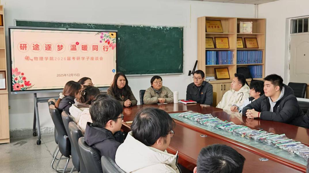 为帮**研学生缓解考前压力,提振备考信心,12月15日下午,物理学院在理化楼404会议室召开了2026届考研学子座谈会。学院党总支书记徐海鹰、院长吴笳宁、党总支副书记宋梅、学工办主任邢磊出席会议,与2026届考研学子齐聚一堂,为同学们送上来自物院大家庭的深切关怀与暖心鼓励。